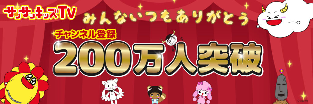 当社では、日頃の感謝の気持ちを込めて、チャンネル登録者数200万人突破を記念したキャンペーンを後日実施予定です。 キャンペーンの詳細については、内容が決まり次第、公式サイトおよび公式SNS等で発表いたします。 今後も「サンサンキッズTV」は、子どもたちが安心して楽しめる動画コンテンツの提供を通じて、子どもたちの成長と笑顔に寄り添うチャンネルを目指してまいります。
